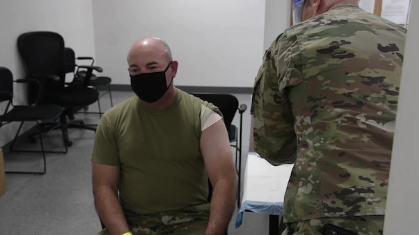 Command Chief Master Sgt. Thomas James of the California National Guard receives his first vaccination and talks to the troops about the experience while offering words of encouragement. Video by David J. Loeffler California National Guard Public Affairs.