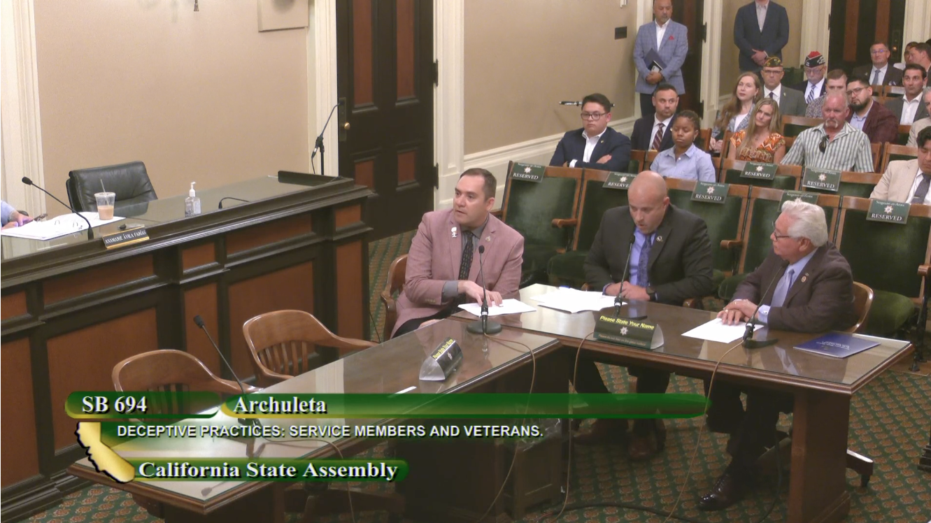 SACRAMENTO, CA — Veterans across California scored an important legislative win this week as Senate Bill 694 – The Veteran Benefits Protection Act, passed out of the Assembly Military and Veterans Affairs Committee and was referred to the Assembly Judiciary Committee for a crucial vote scheduled on Tuesday, July 8.